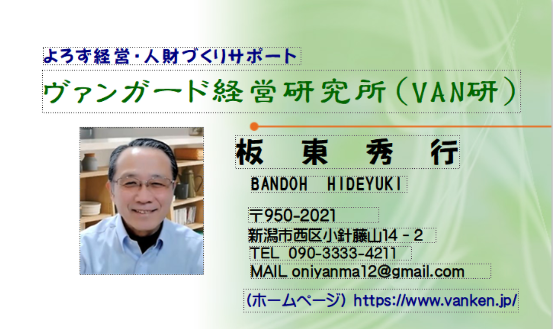 企業概要 社名ヴァンガード経営研究所 所在地〒950-2021 新潟市西区小針藤山14-2 電話番号090-3333-4211 E-mailoniyanma12@gmail.com 代表者板東 秀行 創業2008年 取引銀行楽天銀行 サンバ支店